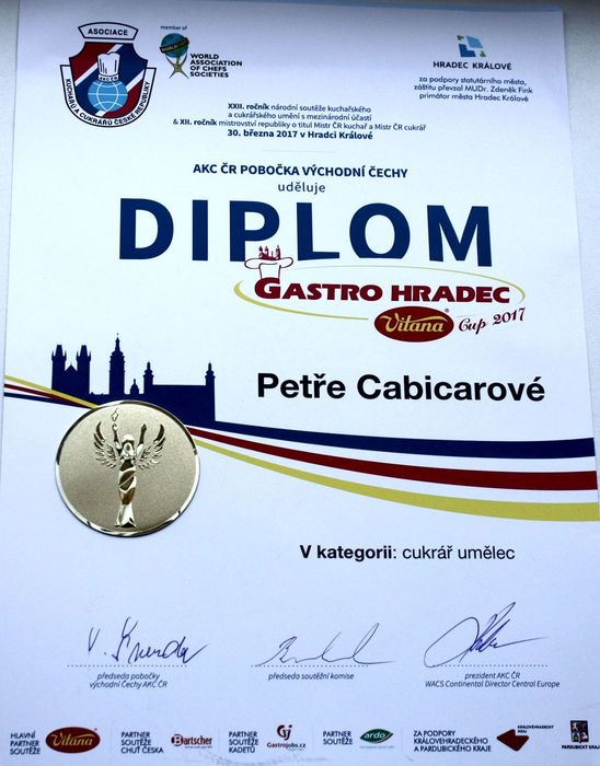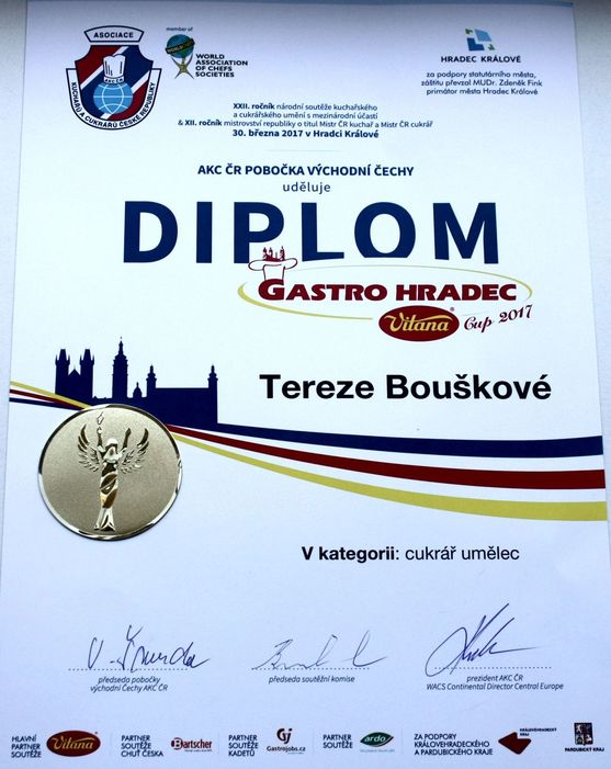 I tak by se dal popsat vynikající výsledek našich dvou cukrářských týmů na mezinárodní soutěži GASTRO HRADEC - VITANA CUP 2017. V Kongresovém centru ALDIS v Hradci Králové soutěžní týmy: Petra Cabicarová ze třídy C3 a Tereza Boušková C2 pod vedením Jany Matějů a Petry Tatíčkové vybojovaly zlatá pásma (1. a 2. místo v naší kategorii cukrář umělec). Naši příznivci, radujte se s námi! Inu - mistrovství v oboru se naučíte poctivou prací na naší škole v Chrudimi!