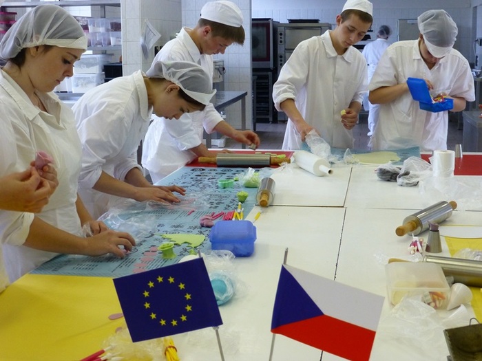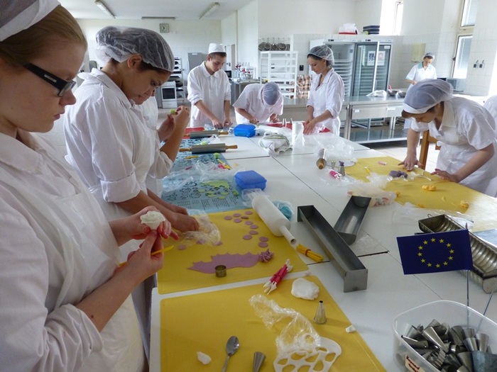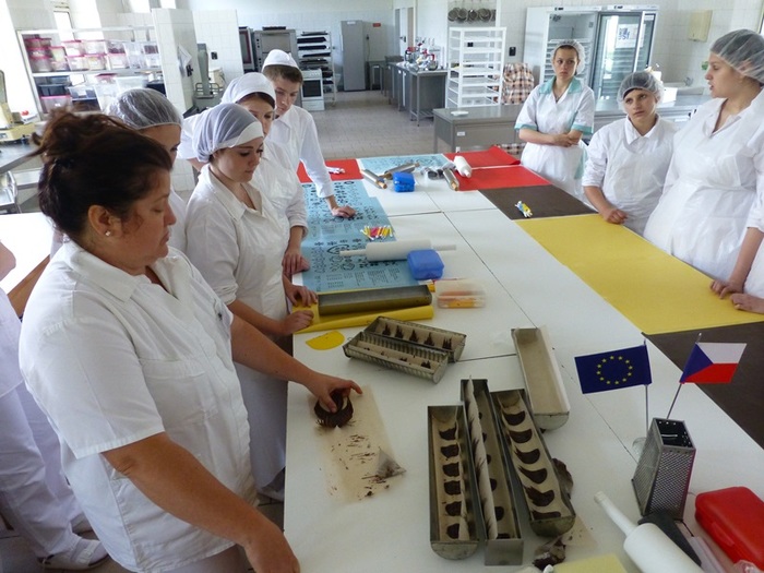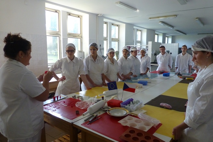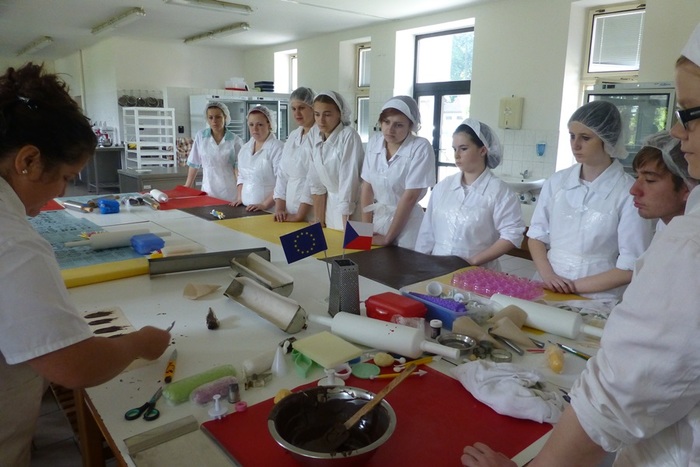 Projekt Rozvoj manuálních zručností a praktických dovedností žáků oboru cukrář v tomto školním roce končíme kurzem pro první ročník. Kurz s názvem Výroba jedlých květin proběhl v pondělí 2. června 2014. Kurz odborně vedla paní učitelka Jana Matějů. Pod jejím vedením se naši nejmladší cukráři učili vyrábět krémové růžičky, krémové lístečky, krémové kopretinky. Pod dohledem paní učitelky si vlastnoručně připravovali mléčnou modelovací hmotu, vyráběli i bílý modelovací cukr a čokoládovou modelovací hmotu. Z těchto hmot modelovali květy různých tvarů – kaly, karafiáty, lilie, pivoňky, tulipány a orchideje. Kurz byl velice zajímavý a pro žáky prvního ročníku určitě inspirativní. Každý z našich prvňáků již dovede vyrobit několik druhů květin nejenom vytlačováním z tvořítek a pomocí vykrajovátek, ale dokáží květiny vymodelovat vlastníma rukama.