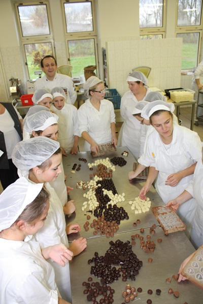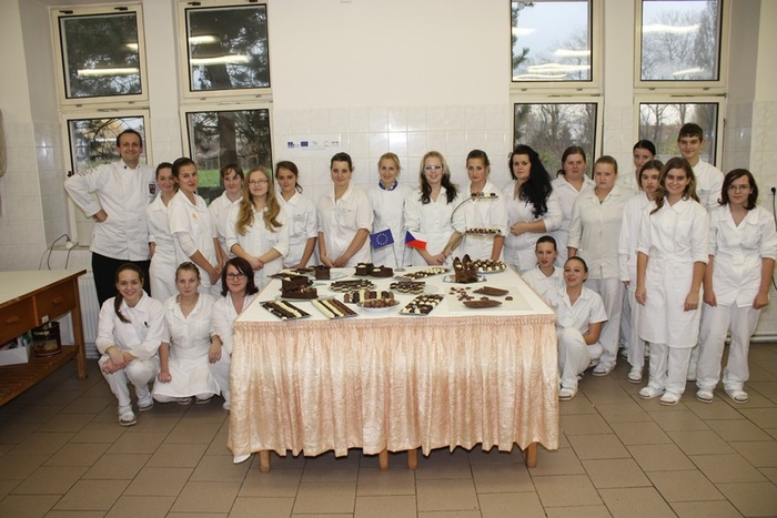 Posledním kurzem v tomto kalendářním roce je kurz s názvem Pralinky 18.- 19. listopadu 2014. Vedli ho lektoři ze Školy chutí manželé Slezákovi. Na tento kurz se velmi těšili naši třeťáci, kteří rádi pracují s pravou čokoládou. Byli jim představeni přední výrobci a dodavatelé pravých čokolád. Ukázali si rozdíl mezi pravou čokoládou a cukrářskými čoko polevami. Všichni si vyzkoušeli výrobu náplní – Ganache (kávová, pistáciová, s červeným pepřem, s perníkovým kořením, citronová), temperaci čokolády, vylívání forem na pralinky, plnění pralinek náplněmi a zavíčkování, vylévání forem na ozdoby a dekorace z čokolády a výrobu plastické čokolády. Vyráběli čokoládové bonboniéry, víčkovali pralinky, vyráběly lanýžové bonbony. Kurz byl pro žáky velice zajímavý, se spoustou cenných rad a nových nápadů, které určitě využijí ve svém budoucím profesním životě.4