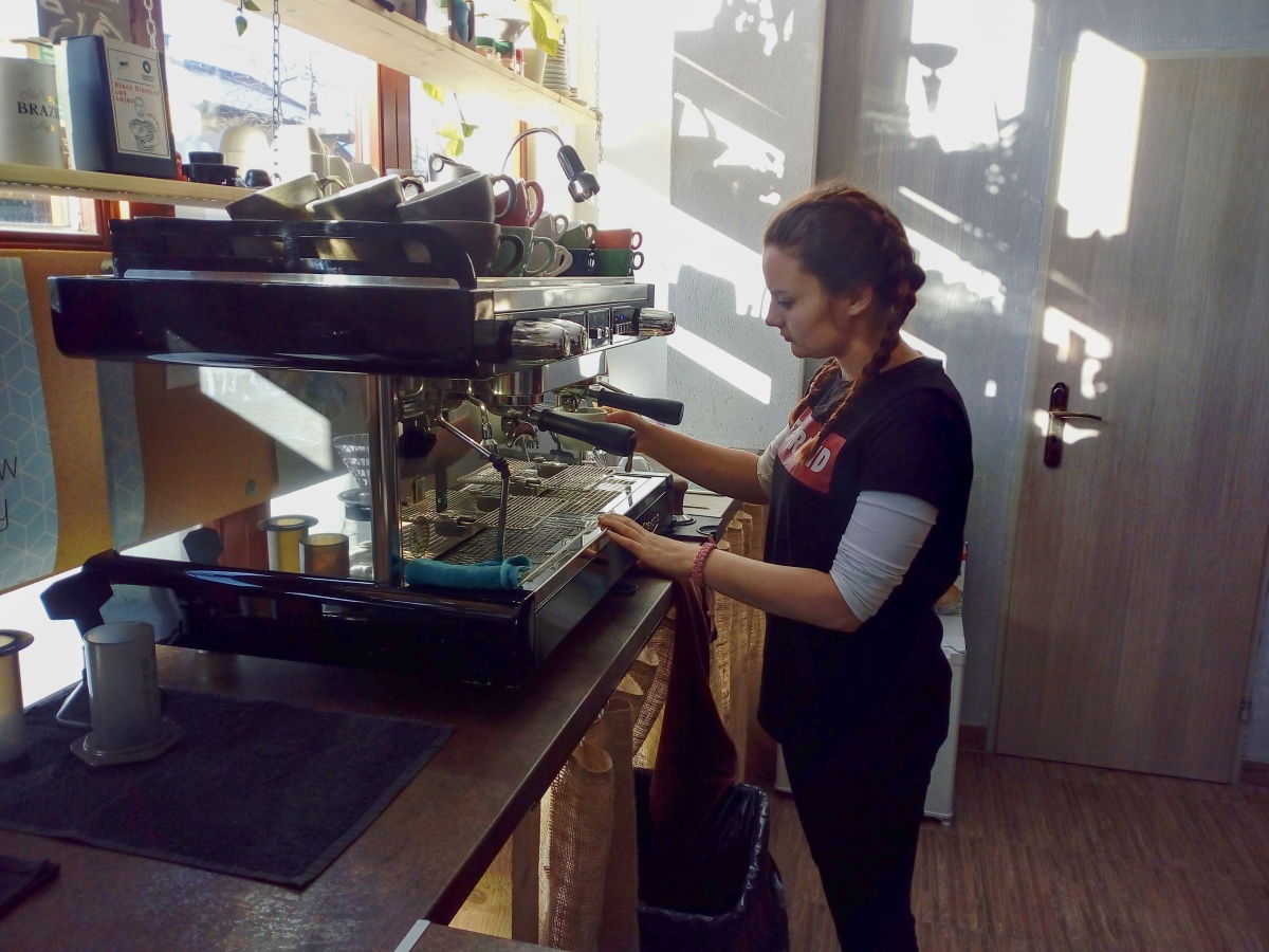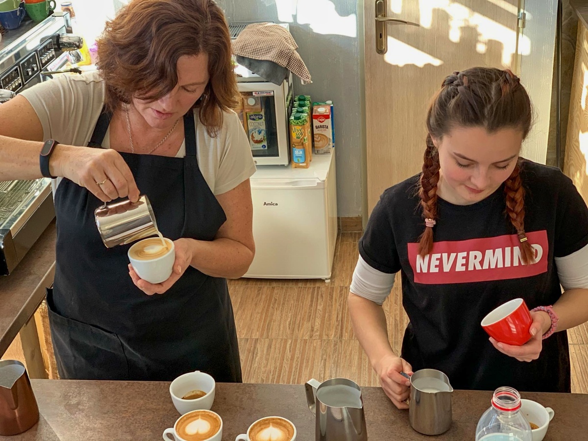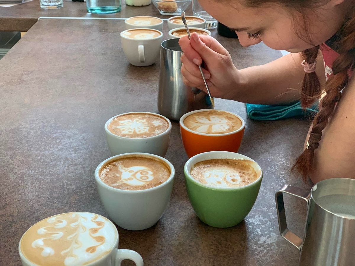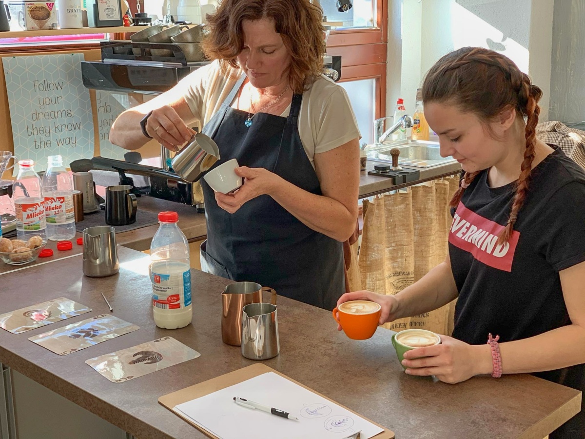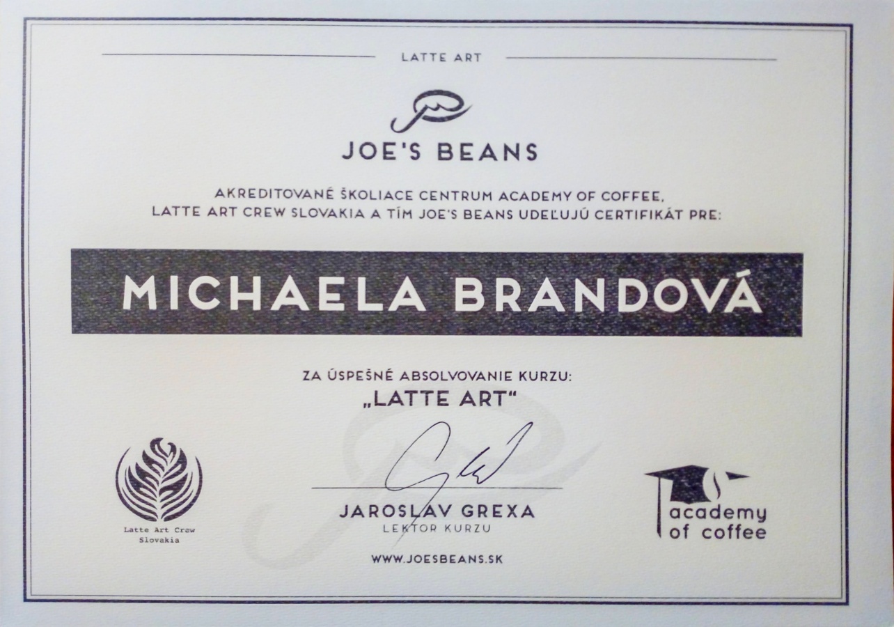 Proto jsme se vypravily během jarních prázdnin do Popradu, abychom společně absolvovaly tento super kurz akreditovaného školícího centra academy of coffee firmy Joe´s Beans pod vedením Jaroslava Grexy. Ve středu po příjezdu jsme se ubytovaly v krásné Vile U Septima, šly se projít do města rozhýbat se po šesti hodinové cestě vlakem, zpět na výbornou večeři a do postele, aby jsme byly připravené na skoro 8 hodinový maratón. Po rychlém seznámení se s kávovarem a ubezpečení se, že informace máme dobré, jen ta zručnost nám schází, jsme začaly s prvními pokusy. Jaro byl moc milý a trpělivý instruktor a myslím, že nám dal spoustu rad a ukázal jak malovat nejen přímo mléčnou pěnou, ale i pomocí latte art pera. Kurz jsme přerušili jen na malou chvíli na oběd a pokračovali až do 15.30. Pak už jsme musely běžet na vlak, který odjížděl v 16.07 hodin.
