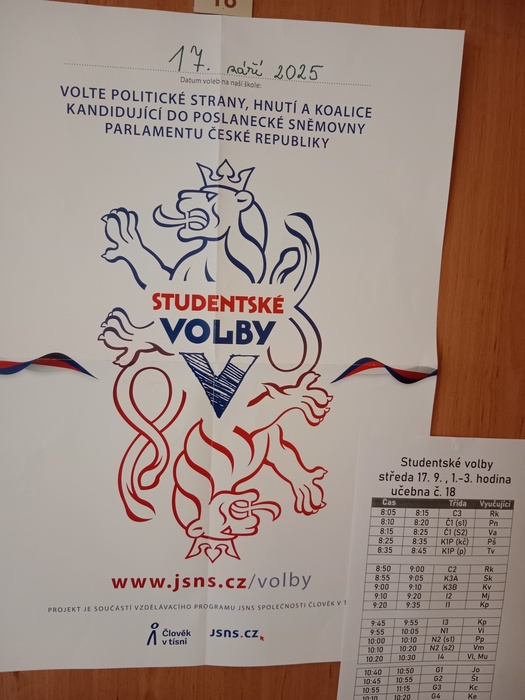 Jednalo se o akci pořádanou organizací JSNS, která spadá pod Člověka v tísni. Připojili jsme se k dalším středním školám v republice (celkem jich bylo 637). Volilo se pouze nanečisto J a pro většinu žáků se jednalo o premiéru. Zjistili jsme, že vlastní proces není nic těžkého, ale zodpovědně se rozhodnout koho vybrat je poměrně náročné. Nakonec volební komise z řad studentů spočítala hlasovací lístky z obou volebních uren, zvlášť žáků SOU a zvlášť studentů SOŠ.